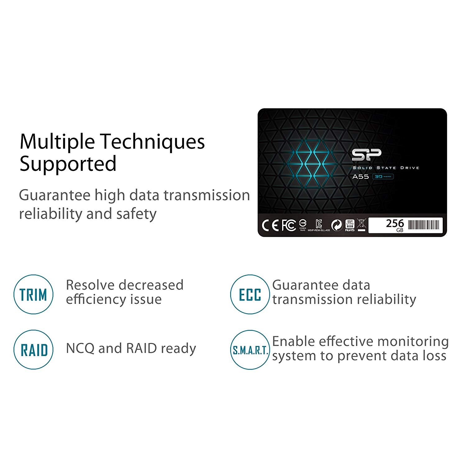 Slim S55 applies the advanced 3D NAND flash that enables higher reliability and better power efficiency than traditional SSDs equipped with 2D NAND flash. Powered by SATA III 6 Gbps interface, the S55 is able to deliver incredibly high transfer speeds that enable short boot time, fast application loading and quick file processing.